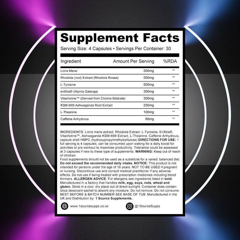 Together with a small dose of caffeine anhydrous to help aid absorption, these ingredients create a balanced nootropic blend that supports mental sharpness, stress resilience, and overall cognitive performance, without overstimulation. Whether you're studying, working on a project, or simply need to stay focused, ALERT1 is the perfect companion for your mental tasks.