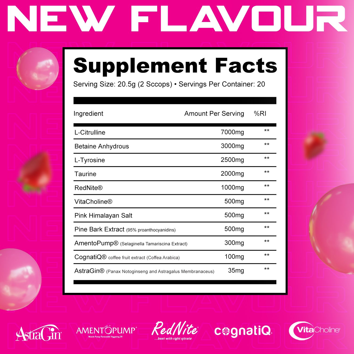 7000mg L-Citrulline: The main staple to most pre workouts, this amino acid will offer reduced fatigue and supports elevated levels of nitric acid which at the dose given will provide huge muscle pumps.