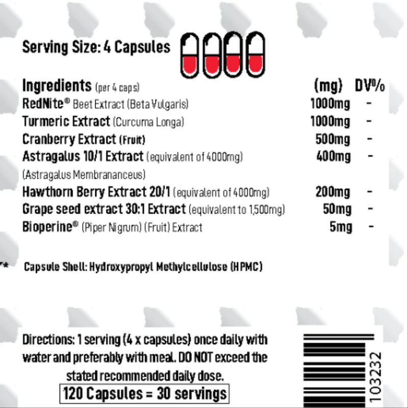 Packed with RedNite® Beet, Turmeric, Cranberry, Astragalus, Hawthorn, Grape Seed & BioPerine®, this formula is designed to keep your body performing at its best while supporting long-term health