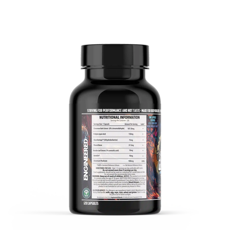 187.5 mg, R-Alpha Lipoic Acid – 150 mg, GlucoVantage® (Dihydroberberine) – 75 mg, Pterostilbene – 37.5 mg, Banaba Leaf Extract (standardized to 1% corosolic acid) – 10 mg, AstraGin® (Panax notoginseng & Astragalus membranaceus Extract) – 10 mg, and Chromium (as Chromium Picolinate) – 10 mg (yielding 100 mcg elemental Chromium).