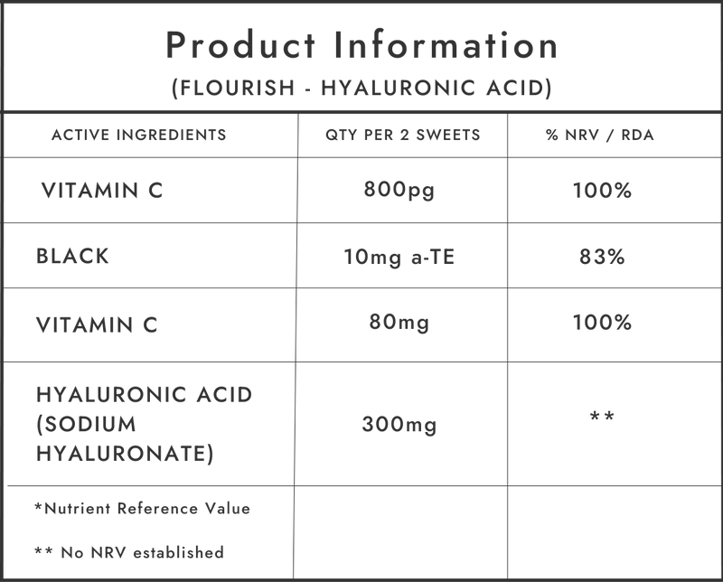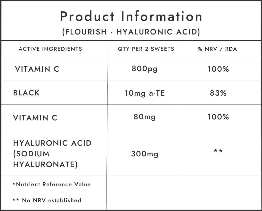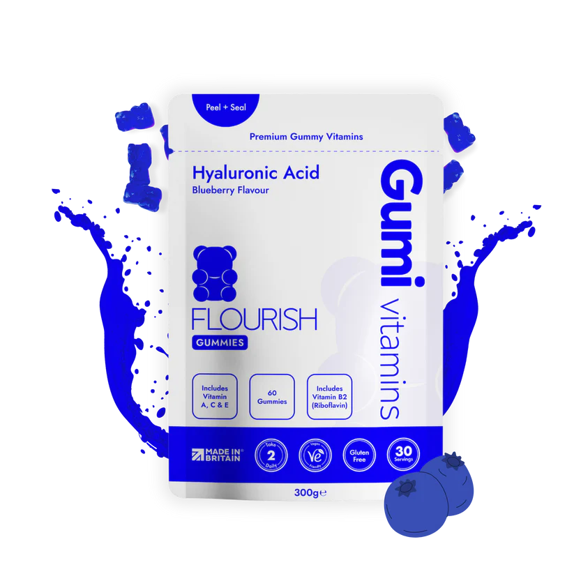 Introducing Flourish Hyaluronic Acid Gummies - the delicious blueberry-flavoured solution packed with a powerhouse of skin-loving vitamins!