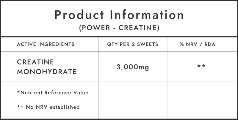 INGREDIENTS: Sweetener (Maltitol), Water, Gelling Agents (Pectin, Gellan Gum), Creatine Monohydrate, Acid (Citric Acid), Natural Flavouring, Acidity Regulator (Sodium Citrate), Medium Chain Triglycerides (MCT) Oil.