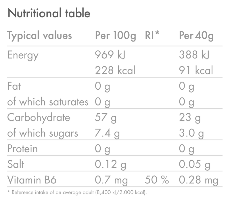 Glucose Syrup, Water, Maltodextrin, Fruit Juice Concentrate (Cranberry 1%, Raspberry 1%), Natural Flavourings, Acidity Regulators (Sodium Citrates, Citric Acid), Preservatives (Potassium Sorbate, Sodium Benzoate), Sea Salt, Vitamin B6.