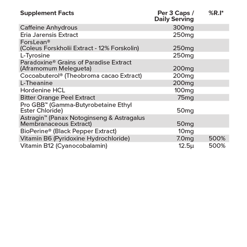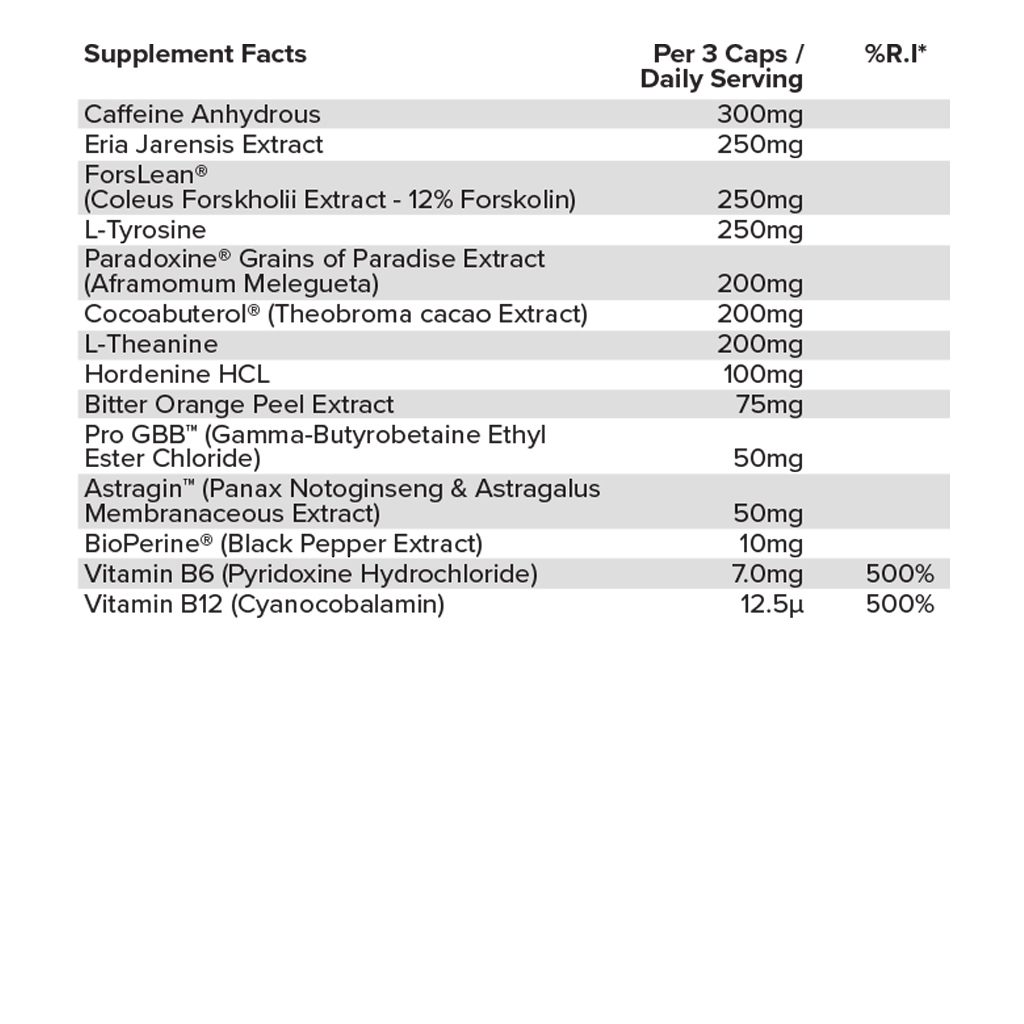 Caffeine Anhydrous, Eria Jarensis Extract, Forslean® (Coleus Forskholii Extract - 12% Forskolin), L-Tyrosine, Paradoxine® Grains of Paradise Extract (Aframomum Melegueta), Cocabuterol® (Theobroma cacao Extract), L-Theanine, Hordenine HCL, Bitter Orange Peel Extract, Pro GBB™ (Gamma-Butyrobetaine Ethyl Ester Chloride), Astragin™ (Panax notoginseng & Astragalus Membranaceous extract), Bioperine® (Black Pepper Extract) , Vitamin B6 (Pyridoxine Hydrochloride), Vitamin B12 (Cyanocobalamin), Bulking Agent (Brown Rice Flour), Bovine Gelatine Capsule Shell (Contains Colouring’s Titanium Dioxide & FD&C Blue2),