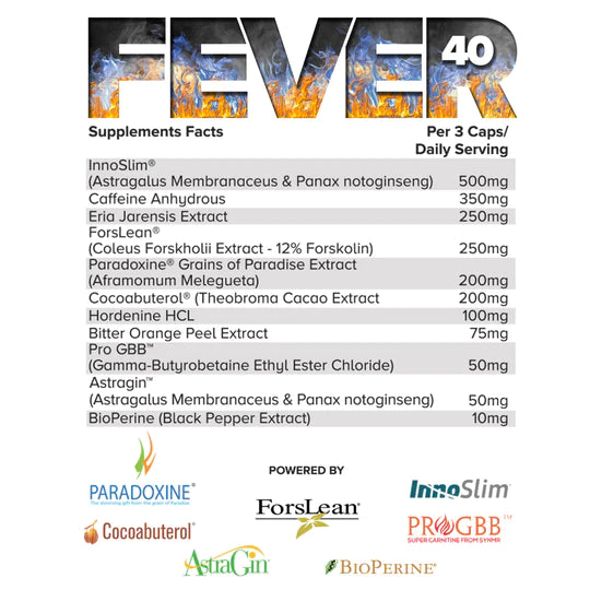 An optimally dosed, synergistic blend of effective ingredients that will help you with your body composition goals. Increase energy, reduce cravings and turn up the HEAT. It can't do it for you but FEVER40 is Hard work's little helper. Made for progress.